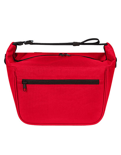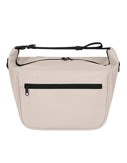 Moderne Kühltasche | Hauptfach mit 2-Wege-Reißverschluss | Großzügige Polsterung | Innen abwaschbar | Einseitig lösbarer, längenverstellbarer Träger mit Gummilasche zur Gurtfixierung | Beidseitig D-Ringe zur Befestigung, z.B.: für optionalen Schultergurt oder Schlüssel | Bodenfüße | Rückseitig Schlaufen zur Befestigung am Fahrradlenker